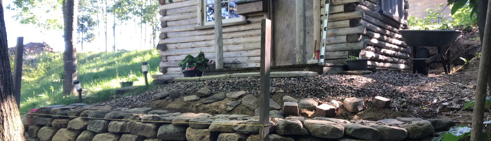 So I did a lot of stepping back and peering at the little stone terrace as it rose next to the cabin. In fact, whenever Nadine caught a glance at me stone-walling, she said I usually had my hands on my hips, arms akimbo, peering at the stones. For inspiration, I nestled a pot of pink and white impatiens next to the terrace.