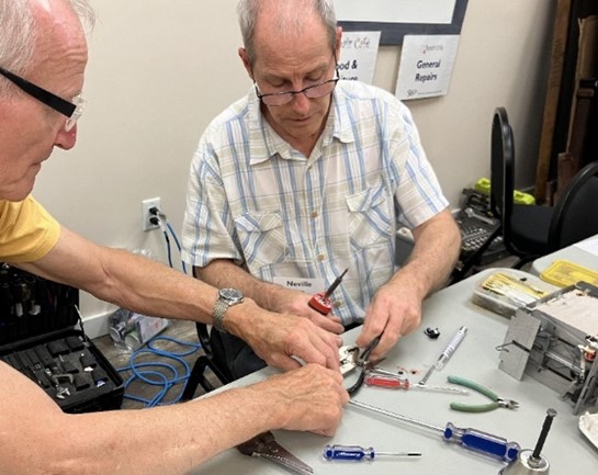 Growing up on a farm in Rhodesia, Neville Tebbit (pictured below at right, with fellow volunteer Jurgen), often helped his Dad fix things. “I would take things apart and wanted to know how they worked,” he recalls. As a teen, he completely rebuilt a “rust-bucket” 1966 Jaguar. These days, Neville, whose professional job involves servicing xray spectrometers used in mining and other sectors, is contributing his fix-it savvy to the SIRCH Repair Café in Haliburton, Ontario.