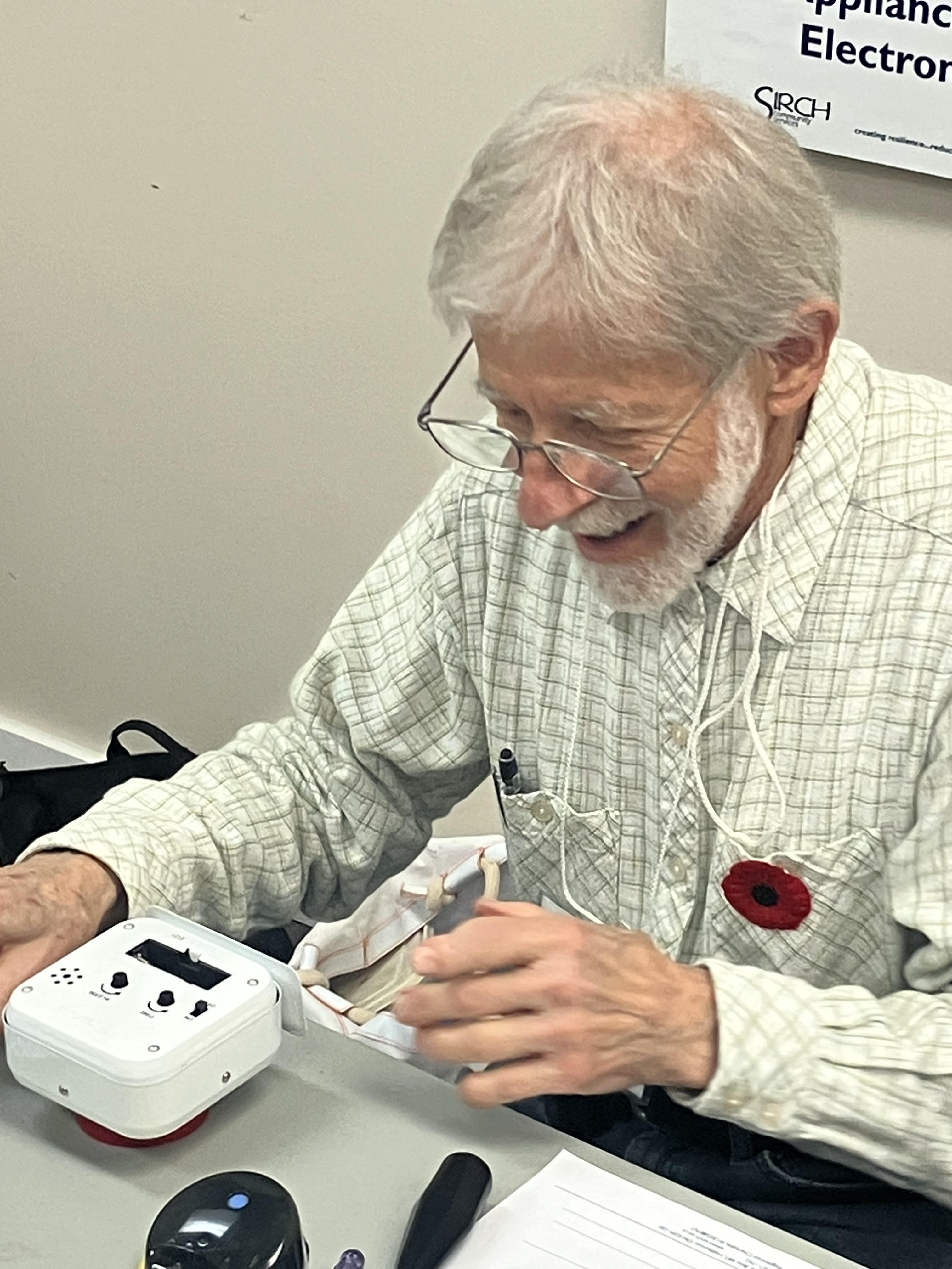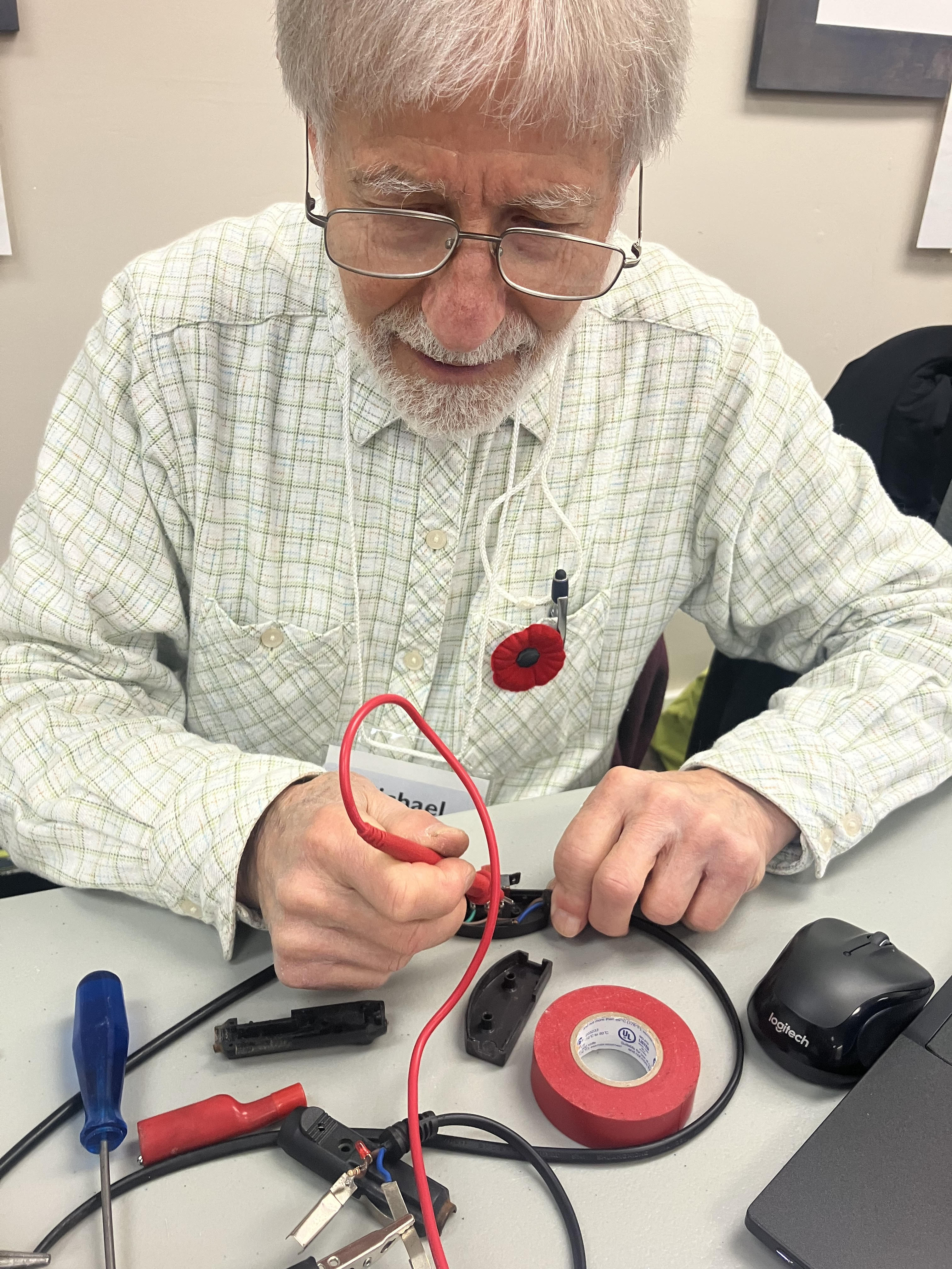 Michael now brings his systems savvy to volunteer roles. Today, he joins about a dozen volunteers at Haliburton’s SIRCH Repair Café to fix a variety of items ranging from electronics to clothing and jewelry. We caught up with Michael when he was disassembling a broken heating pad.