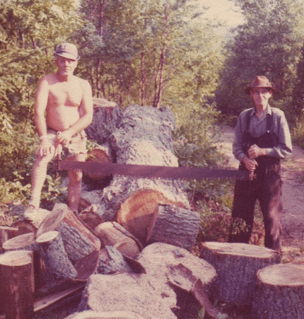Gren Schrader, left, helps Raymond Geeza saw logs for firewood in 1974. Gren was 44 at the time of the photo; his cousin Raymond was 89 and, as Gren recalled, had more stamina with the cross-cut saw! (Photo courtesy of Schrader family.)