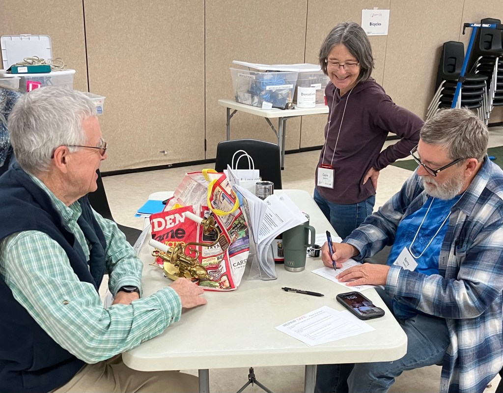 During a pause for lunch, we sit down with volunteer Barry, who’s working the reception desk with his fellow volunteers Gayle (left) and Laurie (right). Barry tallies up the day’s repair forms and reports that 30 guests have brought in 37 items so far.
