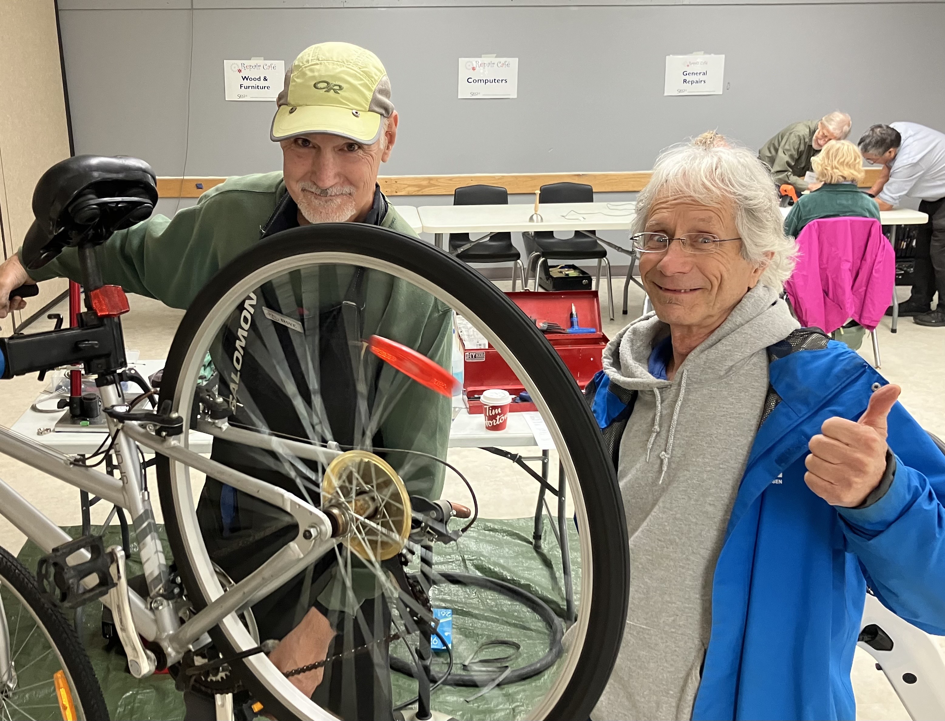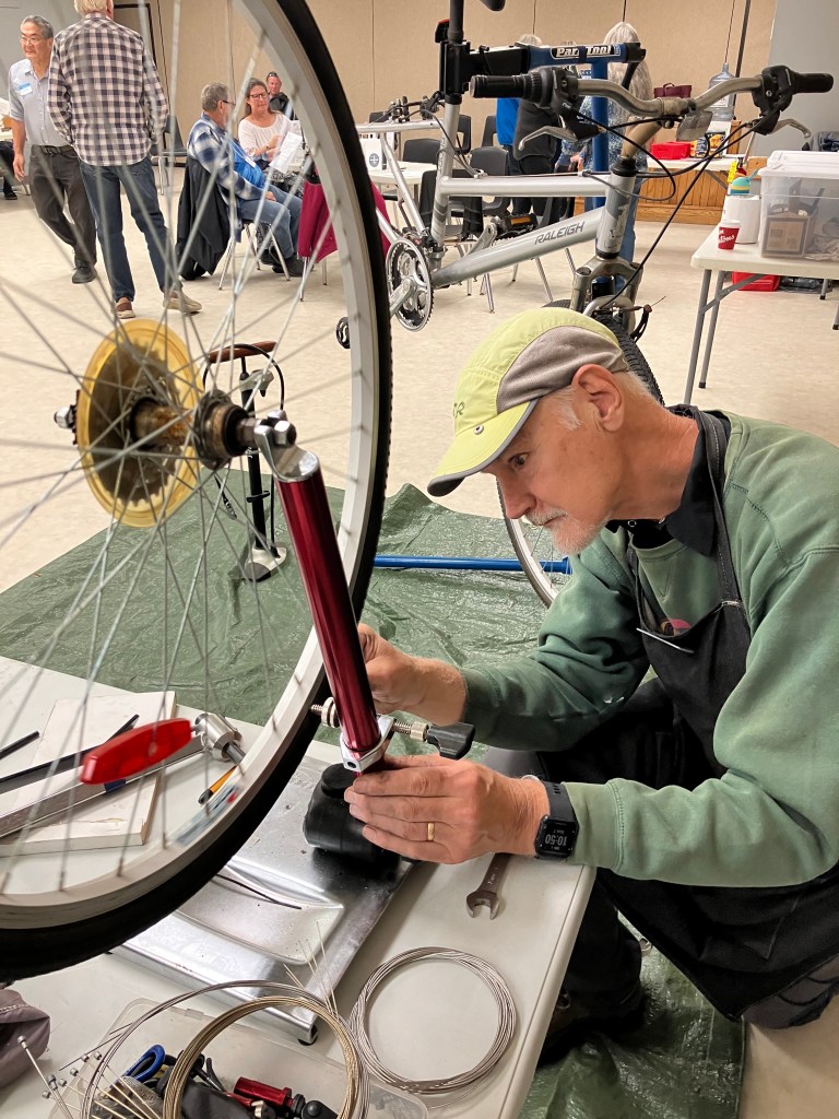 After a quiet first half-hour, there’s a buzz in the air now as more guests arrive with items to be fixed. Volunteer fixer Dave has unpacked his bicycle tools and is testing the “true” of a bike wheel. He’s removed it from the bike and connected it to his truing stand to check the side-to-side and vertical movement. Gary, a local musician, obtained the Raleigh bike from a friend. He enjoys riding it but noticed a thumping in the back wheel.
