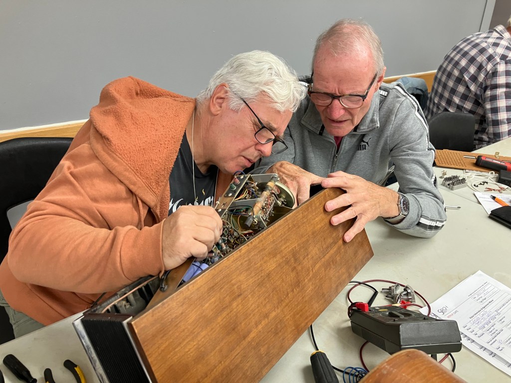 The radio — a keepsake from Caleigh’s Grandma — can still be repaired, but Caleigh has some homework. She will look for a new speaker and aim to visit the next repair cafe to have it installed. Jurgen and Gary provide the specifications for the speaker including the required OHMs (electrical resistance units).