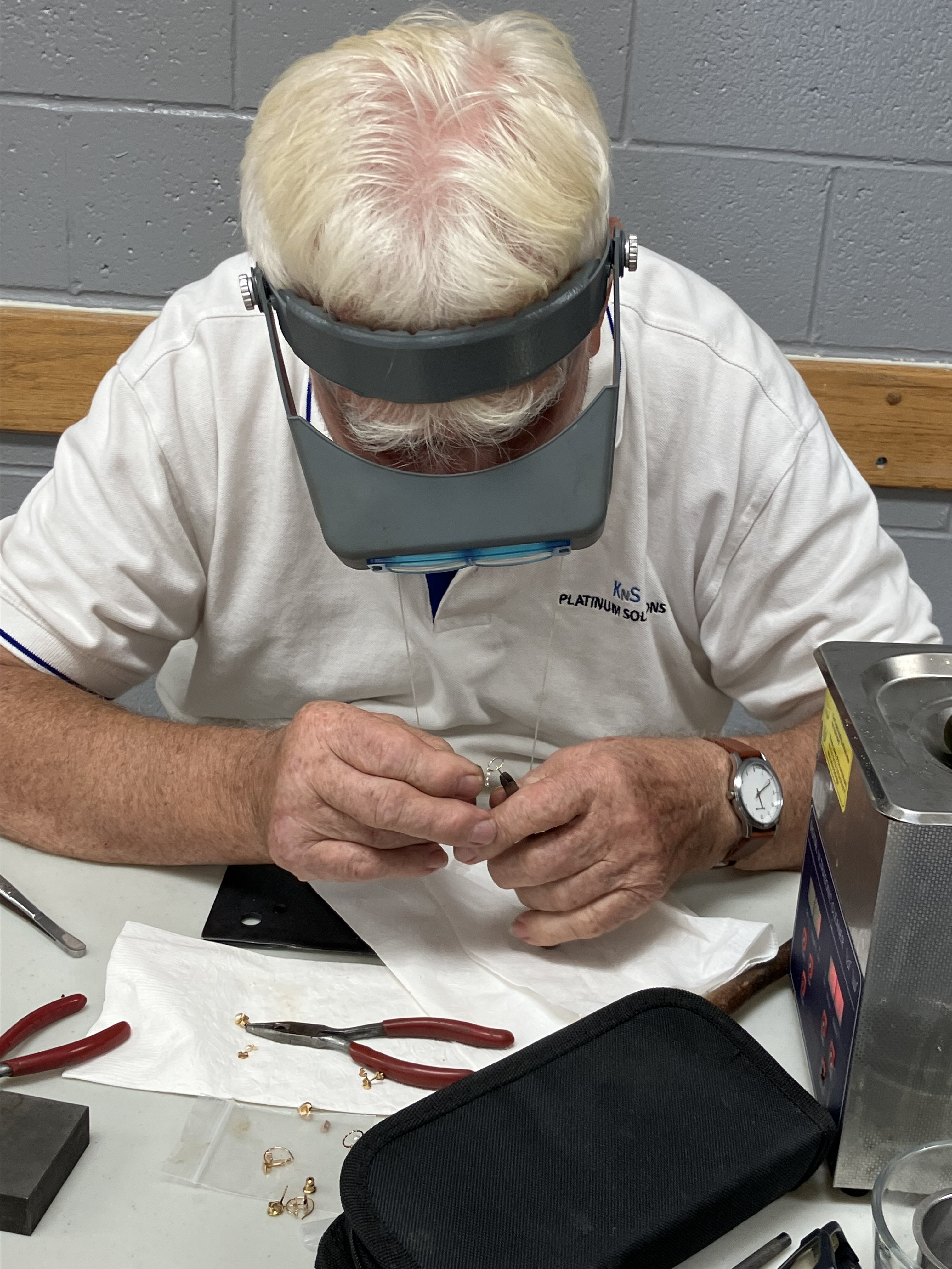Another loyal Repair Cafe fixer is Henry. A master jeweler and goldsmith, he first apprenticed in his trade in the 1950s. He’s still at it today, repairing an assortment of rings, bracelets and other jewelry brought in by guests at the SIRCH Repair Cafe. Henry dons his jewelers glasses to get a close look at each item, and to make expert repairs.