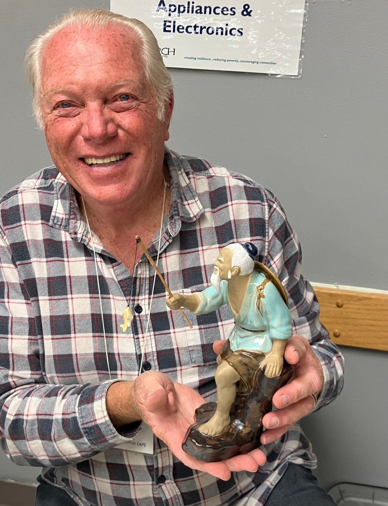 Across the room, fixer Rick tackles an unusual repair — a broken fishing rod belonging to a ceramic Japanese fisherman. The fisherman’s owner, Elisabeth, obtained the whimsical piece from the SIRCH Thrift Warehouse in Haliburton. She realized it would go perfectly with her collection of Bonsai collection.